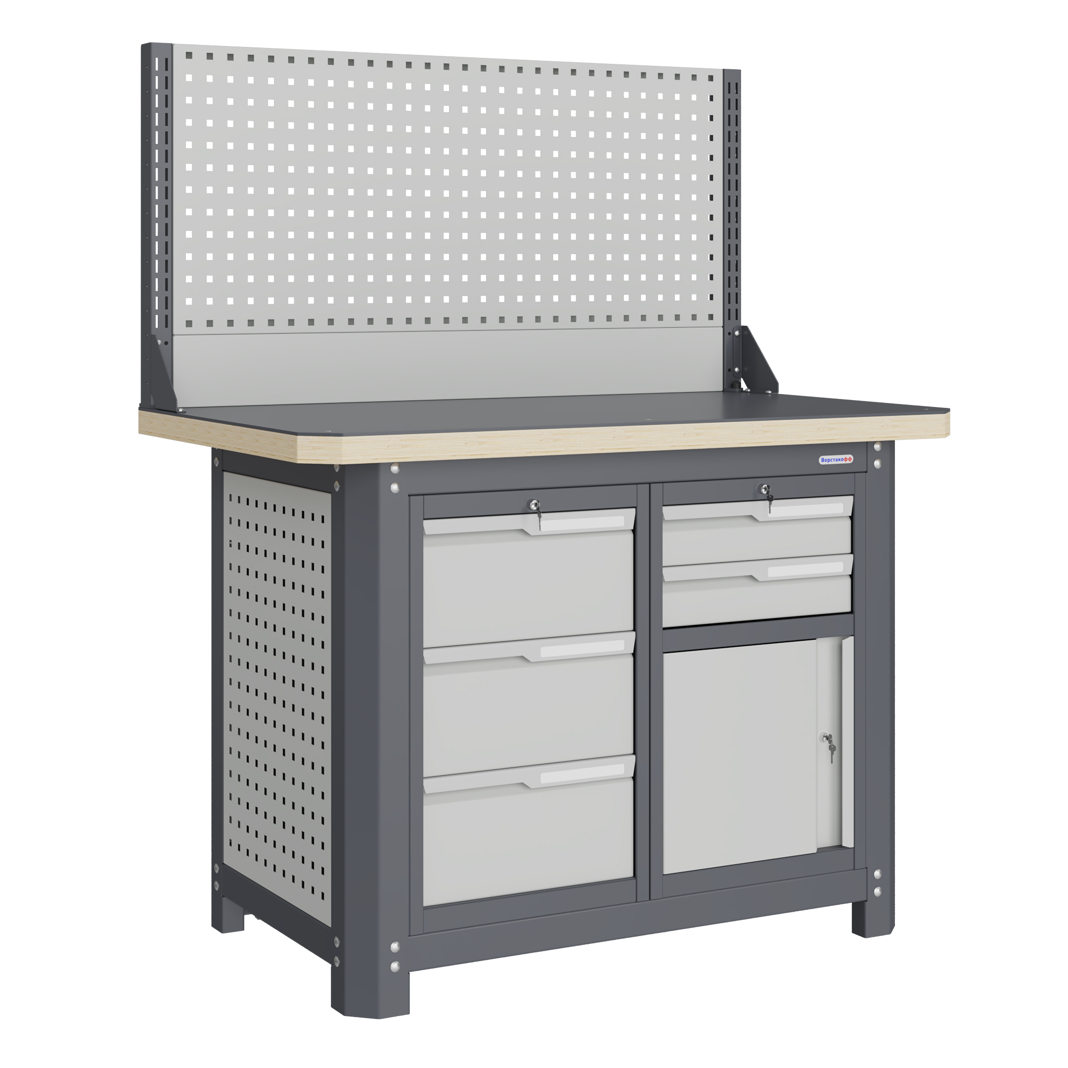 Модули верстака имеют сварную конструкцию из профилированной стали, каждый из которых запирается центральным ключевым замком.