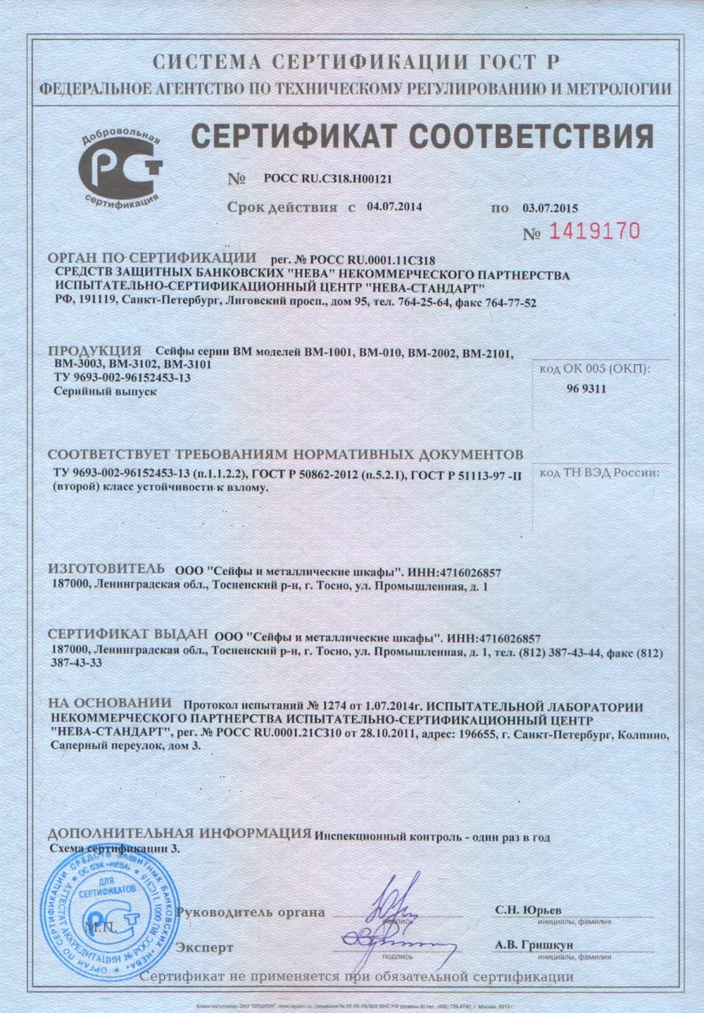 Сейф протестирован по стандартам ГОСТ Р 50862-2012 и ГОСТ Р 51113-97 и причислен к 2 классу взломостойкости и классу 30Б по устойчивости к огню (это означает сохранность бумаг при внешней температуре 1000 ºС в течение 30 минут). В сейфах данного класса предлагается хранить следующие суммы: до 5 млн. рублей – для индивидуальных владельцев; до 2.5 млн. рублей – для юридических лиц.